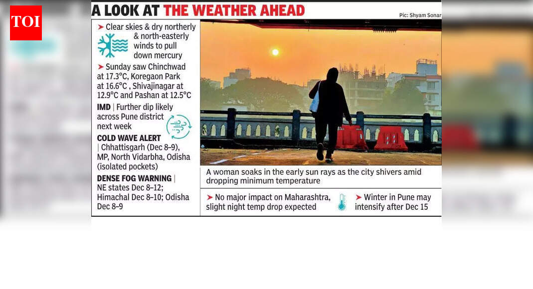 पुणे: मोकळे आकाश आणि कोरड्या उत्तरेकडून आणि ईशान्येकडील वाऱ्यांचे आगमन यामुळे येत्या काही दिवसांत पुणे जिल्ह्यातील किमान तापमानात घट होण्याची अपेक्षा आहे. “पाऱ्यात घसरण अपेक्षित आहे कारण स्वच्छ आकाश आणि कोरडे उत्तरेकडील आणि उत्तर-पूर्वेचे वारे वाहतील. पुणे जिल्ह्यातील सर्व ठिकाणी सकाळची थंडी अपेक्षित आहे,” असे भारतीय हवामानशास्त्र विभागाच्या (आयएमडी) वरिष्ठ अधिकाऱ्याने सांगितले.चिंचवड (17.3°C), कोरेगाव पार्क (16.6°C), शिवाजीनगर (12.9°C), पाषाण (12.5°C) आणि लोहेगाव येथील किमान तापमानासह, रविवारी अनेक महत्त्वाच्या भागात घसरण झाली. पुढील आठवड्यात या ठिकाणी आणखी घसरण होण्याची शक्यता आयएमडी अधिकाऱ्यांनी व्यक्त केली आहे.हवामान खात्याच्या अधिका-यांनी सांगितले की ही घसरण मान्सूनच्या माघारीनंतर डिसेंबरच्या सुरुवातीच्या पॅटर्नचा एक भाग आहे. पुण्याचे दिवसाचे तापमान, तथापि, नेहमीच्या जवळ राहण्याची अपेक्षा आहे, उबदार दुपार आणि थंड सकाळ यांच्यात लक्षणीय फरक आहे.आपल्या विस्तृत अंदाजात, IMD ने म्हटले आहे की, “मध्य प्रदेश, उत्तर विदर्भ आणि ओडिशामधील एकाकी भागात 8 आणि 9 डिसेंबर रोजी छत्तीसगडमध्ये काही ठिकाणी थंड लाटेची परिस्थिती निर्माण होण्याची शक्यता आहे.”8 ते 12 डिसेंबर दरम्यान आसाम, मेघालय, नागालँड, मणिपूर, मिझोराम आणि त्रिपुरा येथे पहाटेच्या वेळी दाट धुके राहण्याचा इशाराही विभागाने दिला आहे; 8 डिसेंबर रोजी पश्चिम मध्य प्रदेशात; हिमाचल प्रदेशात 8 ते 10 डिसेंबर आणि ओडिशात 8 आणि 9 डिसेंबर रोजी. काही उत्तरेकडील आणि ईशान्येकडील राज्यांमध्ये दृश्यमानता काहीशे मीटरपर्यंत खाली येऊ शकते, ज्यामुळे रस्ते आणि विमान प्रवास प्रभावित होईल, असे अधिकाऱ्यांनी सांगितले.IMD नुसार, अनेक हवामान प्रणाली सध्या देशभरातील परिस्थितीवर परिणाम करत आहेत. यामध्ये खालच्या उष्णकटिबंधीय क्षेत्रामध्ये पूर्व बांगलादेशात वरचे-वायू चक्रीवादळ आणि आग्नेय बंगालच्या उपसागरावरील पूर्वेकडील कुंड यांचा समावेश आहे.त्यांच्या प्रभावाखाली, 7 ते 10 डिसेंबर दरम्यान अंदमान आणि निकोबार बेटांवर गडगडाटी वादळे, विजांचा कडकडाट आणि सोसाट्याचा वारा (30-40 किमी ताशी, 50 किमी प्रतितास वेगाने) हलका ते मध्यम पाऊस पडण्याची “खूप शक्यता” आहे. 7 आणि 8 डिसेंबर रोजी जम्मू-काश्मीर, हिमाचल प्रदेश आणि उत्तराखंडमध्ये हलका ते मध्यम पाऊस पडण्याची शक्यता आहे.राज्यभरात रात्रीच्या तापमानात किरकोळ घट अपेक्षित असली तरी या प्रणालींचा महाराष्ट्रावर थेट परिणाम होण्याची शक्यता नाही, असे आयएमडीने म्हटले आहे. तज्ज्ञांनी सांगितले की, 15 डिसेंबरनंतर पुण्यातील हिवाळा आणखी तीव्र होऊ शकतो, जेव्हा थंड उत्तर-पश्चिमी वारे सामान्यत: प्रदेशावर वर्चस्व गाजव